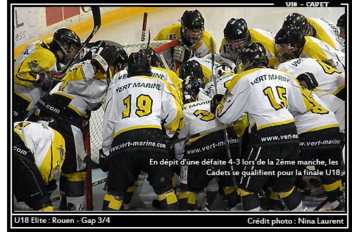 Sentant le vent du boulet se rapprocher, les Dragons retrouvaient un peu d’enthousiasme en troisième période sur le glaçon normand. Plus présents physiquement à l’image de la première présence de la période marquée par une sommation des épaules de Raphael Faure (40’51), les Rouennais semblaient vouloir remettre les choses dans l’ordre. Bien plus agressifs sur le porteur du palet, les Dragons finissaient par faire commettre des erreurs à la défense des rapaces. C’est ainsi que Maxime Griet récoltait une erreur de relance gapençaise. La passe était parfaite, le lancer de Robin Lambart ne l’était pas moins et Rouen recollait au score à 3-4 (48’24) Poussant fortement désormais pour égaliser, les Normands n'y parviendront certes pas mais maintiendront leur billet pour la finale du championnat de France disputée à Amiens... Un « joli classico » en perspective qui fera sans chaud au coeur d'Olivier Duclos l'entraîneur des cadets picards.