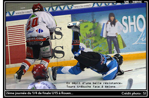Le moral en berne, les tourangeaux auront du mal à se remettre de la fin de tiers picarde. Bien moins accrocheurs, les jeunes ligériens cèderont le morceau de caoutchouc à leurs adversaires de la Somme. De quoi donner des idées au « gang des lunettes de soleil » qui faisait virevolter le palet au fond des filets tourangeaux plusieurs fois avant la sirène finale. Thibaut Thuiller, à 4 contre 4, prenait la tête du mouvement offensif amiénois (48'00), suivi par le «lauréat » du jour Maxence Auvitu qui paraphait un joli triplé (50'10) Pour le gardien du temple tourangeau, le parcours de douleur n'était pas fini d'autant plus que la fine gachette picarde, Guillaume Leclerc sortait son plus joli fusil pour allumer la lucarne adverse (57'39) C'est sur ce score de 9-3 à la faveur des gothiques que les deux équipes se sépareront, Amiens avec deux victoires décrochant son billet pour les 1/2 finales, Tours, bien qu'en position favorable, devant patienter encore.