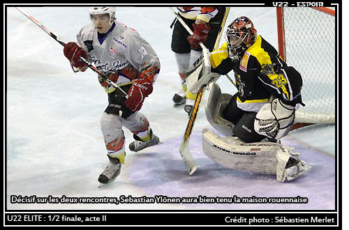 Deuxième volet de la confrontation entre Rouen et Mont Blanc à l'occasion des demi-finales espoirs. Après la séance de la veille qui aura vu l'étriquée victoire 4 buts à 3 des Dragons, une chose est sure c'est une partie tendue qui attendait les deux équipes sur le glaçon de l'Ile Lacroix. Ainsi, dès le début de la rencontre, l'engagement physique était de mise entre les deux équipes.