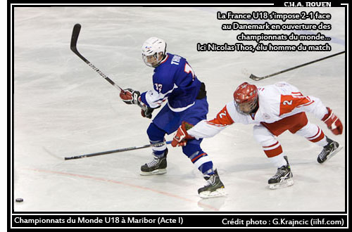 Après une préparation ponctuée d'une défaite face à l'Italie (3-1, but du « serial buteur » picard Maurin Bouvet), les tricolores débuteront leurs championnats du monde en fanfare. En effet, après avoir bouclé la deuxième période sur ce score de parité 1-1, la France finira par prendre les devants dans le tiers fatidique. Privé de façon «surprenante » de son compère de ligne à Amiens, Romain Carpentier, le jeune gothique Marius Serer n'en restait pas moins prolifique devant le filet en recueillant la passe de Nicolas Thos, joueur du match pour le 2-1. Avant de retrouver dès lundi la biélorussie vaincue en ouverture du tournoi 4-3 par la Slovénie, les bleuets pouvaient savourer leur première victoire dans ce tournoi face aux Danois 2 buts à 1.