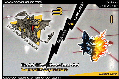 Après une semaine d'entraînement un peu compliquée, les Dragons Cadet pouvaient être un soupçon anxieux à l'idée de croiser les crosses sur leur glaçon face à l'un des favoris du championnat Grenoble. Pour autant, dès l'échauffement, l'équipe rouennaise semblait à l'aise dans ses patins et fortement motivée à l'idée de mettre à mal cette équipe iséroise emmenée par sa muraille dans les buts Antoine Bonvalot. Finalement, le titulaire en équipe de France U18, bien qu'auteur d'une jolie partie, sera éclipsé par la présence de son homologue d'en face, le minime surclassé Quentin Papillon qui pourra sans contestation possible décrocher l'une des étoiles de la rencontre.
