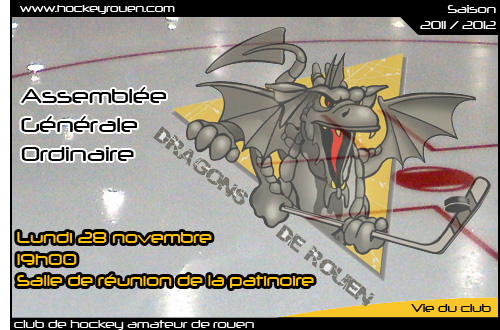 L'assemblée Générale du Club de Hockey Amateur de Rouen se déroulera le lundi 28 novembre 2011 à partir de 19h00 dans la salle de réunion de la patinoire de Rouen située au premier étage (entrée par les vestiaires club)