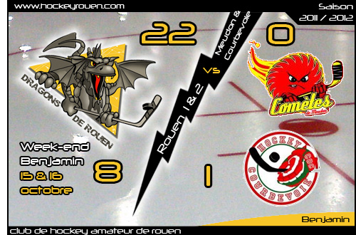 Intercalés au sein des matchs de la Ligue Nord – Normandie, le week-end du 16 et 17 octobre 2011 était consacré aux matchs « intercos » disputés avec les clubs de l'Ile de France. Au programme donc pour les benjamins une double joute : Meudon pour Rouen 1 sur l'Ile Lacroix et Courbevoie pour Rouen 2 disputé à la patinoire Thierry Monier.