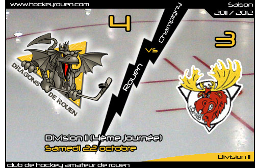 Titulaires d'un score favorable et d'une avance de trois buts au tableau d'affichage, les Rouennais se feront quelques frayeurs sur les deux périodes restantes. Auteurs d'un d'un début de saison intéressant ponctué de deux victoires (9-3 à Metz et 7-3 face à Chambéry) pour une seule défaite chez le leader Français Volants (7-4), les Elans de Champigny, bien plus à l'aise au sein de cette division 2 que lors des précédents opus, n'en avaient pas fini avec cette rencontre. En effet, à l'instar de la première rencontre face à Evry où les Dragons avaient du céder à leurs adversaires deux périodes, face à Champigny, ils ne parviendront pas à endiguer les assauts franciliens. Revenant à 4-2 à la mi-match (32'32), au gré d'un avantage numérique bien négocié, Champigny sur Marne en troisième période ramènera le score à 4-3 (48'13) De quoi donner des sueurs froides aux Dragons qui parviendront, tout de même à sceller le score en l'état en dépit de la sortie du portier parisien pour créer le surnombre (59'44)