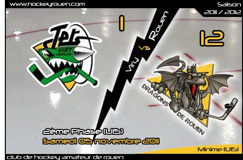 Premier match de la 2ème phase pour les minimes rouennais depuis la réunification avec les candidats de l'Ile de France. Désormais engagés dans une poule à six aux cotés des deux équipes d'Amiens, Meudon, l'association Neuilly / Champigny et Viry, les Dragons de Rouen auront débuté la deuxième ronde sereinement en s'imposant dans la patinoire essonnienne 12 buts à 1.