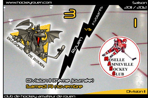 Avec une telle entame de troisième période, les Dragons se trouvaient alors dans un fauteuil pour remporter le match. Pouvant compter sur un portier efficace dans sa cage, les rouennais géraient leur fin de rencontre sereinement. Sans paniquer, sans trop en faire, la réserve rouennaise s'envolait vers un probant succès à domicile. Même si au gré d'un avantage numérique les mosellans réduisaient la marque (56'06), les Dragons tenaient bon leur victoire. Au courage, à l'abnégation, ils résisteront face à la légion slovaque d'Amnéville et profiteront d'un filet déserté pour ajouter un dernier but en cage vide. Rouen s'imposait 3 buts à 1 au terme de cette rencontre particulièrement serrée. De quoi mettre du baume au cœur avant le déplacement à Annecy...