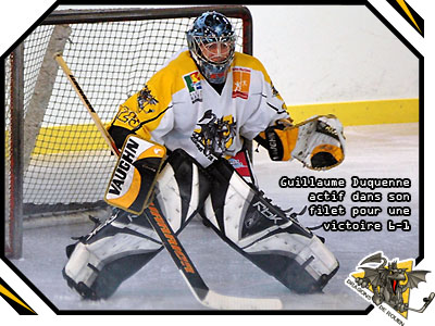 Pour autant, à l'instar des premiers matchs où les rouennais peinent à trouver le chemin du filet en première période, les affaires tardaient à se décanter. En effet, bien aidé par un Guillaume Duquenne tenace dans sa cage, les seino-marins devaient résister à deux séquences en infériorité numérique (06'48 & 08'06) avant de se montrer un peu plus volubiles. Ainsi, profitant d'un bon travail digne d'un numéro 7, Vincent Guezou offrait le premier palet de but à Damien Bourguignon, tout heureux d'inscrire le deuxième but officiel de sa nouvelle carrière rouennaise (13'41) Libérés de la pression d'un score vierge, les Dragons tenteront bien de boucler la période sur un break au score. En vain, les deux équipes regagnaient le vestiaire sur ce court avantage d'un but.