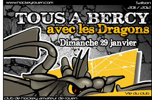C'est pourquoi, le Club de Hockey Amateur de Rouen vous propose d'aller soutenir les Dragons lors de la finale de la Coupe de France le dimanche 29 janvier 2011 (match à 15h00, départ de la patinoire de Rouen aux alentours de 10h00) avec un déplacement en car (aller-retour de la patinoire de Rouen jusqu'au Palais Omnisport de Paris Bercy + place pour le match et les différentes animations)