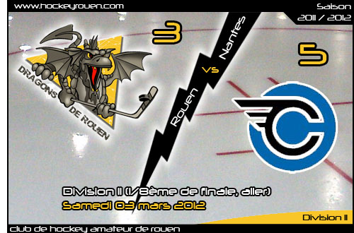 Défaite 5 à 3 des Dragons pour ce premier match des play-offs disputés sur l'Ile Lacroix. Avant de fêter leur qualification à coup d'ouzo, les Nantais devront négocier le match retour disputé chez eux avec une marge de deux buts. Un gros challenge qui attend les Dragons s'ils veulent poursuivrent leur aventure en Division 2 pour cette saison 2011-2012. Depuis la mise en place de cette formule de play-offs en Division 2, 63 matchs auront été disputés, sur les 54 victoires acquises au match aller, 43 auront été entérinées d'une qualification, 2 seules équipes auront su remonter un déficit de deux buts au match aller (Dunkerque en 2011 et Lyon en 2009) et jamais une équipe moins bien classée ne sera parvenue à créer cet exploit. Aux Dragons de Division 2 d'écrire l'histoire, cela tombe bien, c'est ce que l'on sait faire de mieux à Rouen...;o)