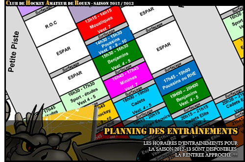 Le planning des entraînements pour la saison 2012-2013 est désormais disponible en cliquant ici. (Horaires susceptibles d'être modifiés, merci de consulter régulièrement les panneaux d'affichage de votre catégorie à la patinoire)