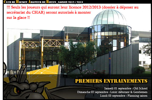 ATTENTION ! Seuls les joueurs qui auront reçu leur licence 2012/2013 à jour seront autorisés à monter sur la glace ! Remise du dossier IMPERATIVE auprès du secrétariat au plus tard la veille du premier entraînement.
