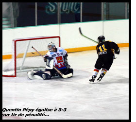Enlacés les uns avec les autres, les joueurs normands faisaient bloc tandis qu’André Svitac, l’entraîneur rouennais préférait rester derrière ses joueurs, n’écoutant que les réactions du public pour connaître le déroulement de la fusillade tandis que Frédéric Robinet restait statufié, de marbre, noué par l’angoisse. Edouard Dufournet ouvrait le bal et offrait le 1-0 peu de temps avant que Quentin Pepy ne s’élance… Raté… Non ! L’arbitre faisait retirer le tir au but après que le portier ait esquissé un mouvement illicite dans sa cage. La deuxième tentative était la bonne, Quentin donnait le 2-0 et la chance tournait à la faveur des Dragons, les grenoblois ayant vendangé leurs deux essais (Treille & Leblond) Tandis que Julien Correia ne pouvait ajouter un troisième filet, Bertrand Laugier redonnait de la vie à la patinoire grenobloise…. 2-1…
