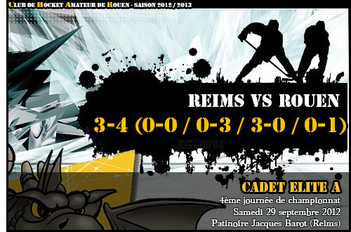Cadet Elite A (4ème journée - Samedi 29 septembre 2012) Reims - Rouen 3-4 (0-0 / 0-3 / 3-0 / 0-0 / 0-1 tab) 21:42: 0-1 Rouen: 6: Vincent NESA 30:25: 0-2 Rouen: 15: Romain CAMBRAY 45:52: 1-3 Reims: 91: Luca LATREUILLE (9: Valentin ROUFFAUD) 50:24: 2-3 Reims: 9: Valentin ROUFFAUD (91: Luca LATREUILLE) 55:27: 3-3 Reims: 87: Josef DVORAK