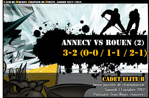 Une rencontre de hockey se joue parfois en peu de chose. L'Elite B rouennaise en aura fait la cruelle expérience lors de son déplacement à Annecy pour le compte de la 6ème journée. En cinq minutes d'un début de troisième période mal assumé et deux buts encaissés, les efforts rouennais consentis face aux Chevaliers du Lac auront réduit à néant, les contraignant à s'incliner 3 buts à 2 face aux locaux.
