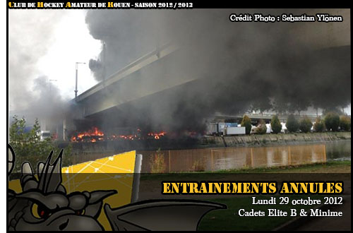 Même si le Dragon aura craché du feu tout le week-end dans les différentes catégories du Club de Hockey Amateur de Rouen, c'est un tout autre incendie qui se sera propagé à proximité de la patinoire de l'Ile Lacroix. Aux alentours de 10h40, deux camions circulant sur le pont Mathilde situé juste au dessus de la patinoire, auraient pris feu dont l'un transportant des hydrocarbures. Les personnes présentes au sein du Centre Guy Boissière ont été invité à quitter au plus vite les lieux. L'incendie s'est propagé au niveau des quais de la rive gauche de la Seine au niveau des caravanes des forains de Saint-Romain.