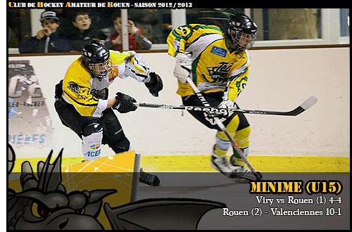 Plus heureux, les Minimes 2 n'auront pas fait de quartier face à Valenciennes. Là encore dans un duel qui l'oppose à Amiens 2, l'escouade au Dragon n'aura pas plié face aux « gens du nord » Alors qu'au match aller, les Dragons étaient parvenus à s'imposer 5 buts à 0, sur l'Ile Lacroix, l'armistice entre les deux formations aura été signée sur la victoire des Dragons 10-1. En s'imposant face aux Diables Rouges, les Dragons enregistrent leur troisième victoire en quatre rencontres et rejoignent ainsi au sommet du classement avec 6 points Amiens 2, titulaire d'un match en moins. Battus en match d'ouverture à domicile justement par les jeunes gothiques (2-4), les Minimes 2 rouennais auront l'occasion de prendre leur revanche le week-end prochain en déplacement en Picardie pour le match retour avec comme trophée pour la suprématie au sein de cette poule pour l'une des deux équipes.
