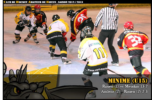 Pour rester au contact au classement de son rival amiénois au classement, charge à l'équipe minime 2 de Rouen de prendre des points au Coliséum pour une confrontation directe face à Amiens 2. Battus lors du match aller 4 buts à 2 dans la tanière du Dragon, les jeunes rouennais de Rouen 2 auront réussi une bien jolie opération ce week-end en allant s'imposant chez les picards 3 buts à 2 au terme d'une rencontre à l'issue incertaine. Jusqu'alors invaincue, l'équipe d'Amiens 2 concède son premier revers de la saison en championnat et cède du coup sa première place aux jeunes Dragons. Seul bémol pour les Rouennais, la différence de but. Avec un match en plus au classement, les Dragons occupent virtuellement le fauteuil de leader. Amiens, au bénéfice d'une possible victoire lors de son match en retard, bénéficie d'une meilleure différence de buts sur les Dragons en cas d'égalité (défaite 4-2, victoire 3-2 pour les Dragons) Reste encore deux confrontations face à Amiens 2 le 12 janvier en Picardie et le 09 février à Rouen pour déterminer définitivement le leader de la Poule Minime Excellence.