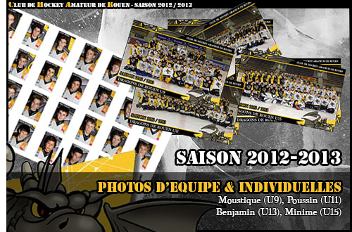 Les photos individuelles et d'équipe pour les catégories U9 (moustiques), U11 (poussins), U13 (benjamins) et U15 (minimes) sont disponibles dans