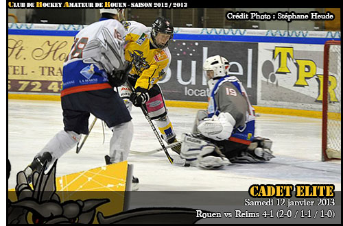 On avait laissé les cadets rouennais se faire la bise pour la nouvelle année au pied du Mont Blanc après leur première victoire en 2013 face à Hockey 74 (lire ici), retour à la maison pour les Dragons cette fois face à Reims, 7ème au classement pour un deuxième passage après le 9-1 subi par les champenois à la fin du mois d'octobre lors de la 7ème journée.