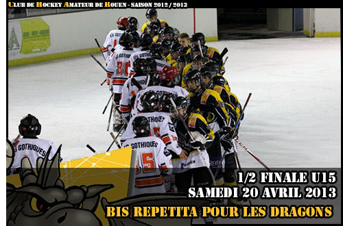 A l'instar de l'édition 2011-2012, c'est en demi-finale que Dragons de Rouen et Gothiques d'Amiens se livraient bataille pour décrocher officiellement une des deux places qualificatives pour la finale du championnat de France U15. Tout comme la saison dernière, les Dragons seront parvenus à s'imposer face à Amiens, cette fois 4 buts à 2 au terme d'une rencontre menée solidement par les protégés de Daniel Babka.