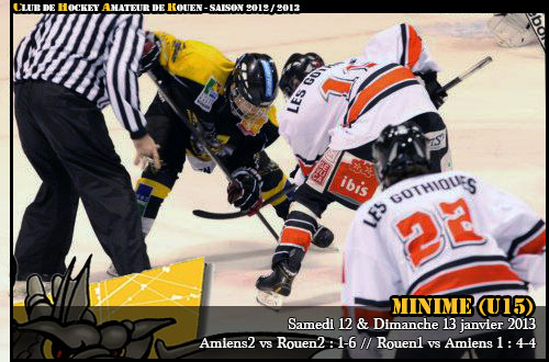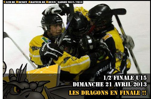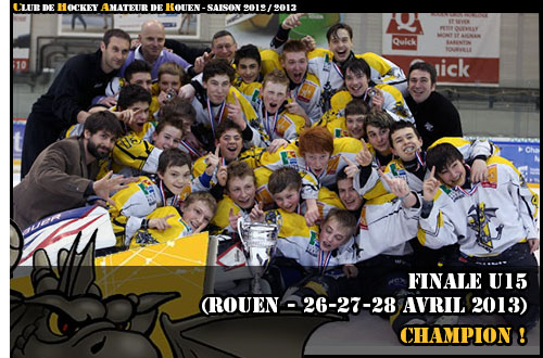 C'est une nouvelle sympathique page de l'histoire du Club de Hockey Amateur de Rouen que les Minimes Rouennais 2012-2013 auront écrit pour ce dernier week-end d'avril 2013. Déjà sacré à sept reprises (1999, 2000, 2001, 2005, 2006, 2007 & 2008), le Club de Rouen pouvait rajouter une 8ème couronne U15 à son armoire à trophées, le 18ème titre de l'histoire du hockey mineur jaune et noir au terme d'une finale haute en couleurs. En effet, à l'issue de la première journée de ce carré final rouennais (présentation), tous les indicateurs semblaient au vert pour les Dragons. A l'instar des demi-finales, un début de match puissant leur permettait de dominer Amiens rapidement au tableau d'affichage, 3-1 à la fin du 2ème tiers, grâce à un céleste triplé de Justin Addamo, déjà auteur de six buts en demi-finale. En dépit du retour des picards en grâce avec un doublé de Matisse Bienaimé et un but de Louis Olive, les Rouennais ne lâcheront pas l'affaire s'imposant 4 buts à 3, Antoine Figueira complétant la liste des buteurs rouennais (résumé) Dès le lendemain, les sourires de la veille semblaient bien loin (bilan journée 1). Face à Villard de Lans, les Dragons passeront à coté de leur sujet face à une courageuse équipe iséroise qui restait pourtant sur un lourd revers face à Grenoble 7-2 à la première journée (résumé). Après avoir mené au score par deux fois, Antoine Figueira puis Victor Ranger trouvant comme réponse des égalisations à 1-1 et 2-2 de Clément Tognan, les Normands se feront surprendre dans l'ultime minute par un but de l'attaquant villardien Pierre Robert pour s'incliner 2 buts à 3 (résumé). Avec la victoire, également sur le score de 3-2 (résumé), de Grenoble sur Amiens, au soir de la deuxième journée (bilan journée 2), plus que jamais, les Brûleurs de Loups semblaient en passe de succéder aux Gothiques d'Amiens, sans victoire après deux matchs, l'oeil triste à l'idée de voir leur série de quatre titres consécutifs s'interrompre sur les bords de Seine. Avec la possibilité d'une égalité à trois en cas de succès de Villard-de-Lans sur Amiens à la dernière journée, les Dragons, en ballotage défavorable, verront d'un bon œil le réveil amiénois à la dernière journée pour une victoire rouge et noir 6-2 (résumé), synonyme de médaille de bronze pour les picards mais surtout de duel ultime entre Rouen et Grenoble pour le dernier match de ce carré final, avec à la clef pour le vainqueur, le titre de champion de France 2013. Toute une histoire. Oubliés les affres du match de la veille, c'est une partie parfaite que les protégés de Daniel Babka livreront face à Grenoble. Bien que concédant l'ouverture du score à Grenoble par Hugo Sarlin, les rouennais parviendront à réagir violemment en accélérant, sortant au passage du match les Brûleurs de Loups. Ainsi, après avoir neutralisé le score à 1-1 par Justin Addamo, un tiers médian de haute volée qui voyait les Dragons inscrire trois buts par Justin Addamo, Sacha Guillemain et Hugo Dumont pour une seule réponse iséroise, celle de Jordan Enselmoz, permettait à l'équipe normande de basculer dans le troisième tiers en menant 4 buts à 2.
