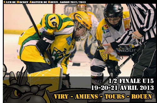 Avec la perspective de disputer le carré final, sur les bords de Seine, à la maison, dans l'autre demi-finale, les Dragons rouennais n'avaient pas d'autre ambitions que de décrocher le plus rapidement possible leur qualification au terme d'un week-end parisien qui s'avérera plutôt heureux pour les rouennais (présentation). Le trio de la poule Ile-de-France – Nord – Normandie reconstitué, les Dragons bénéficiaient d'un solide tour de chauffe à la première journée. Avant de retrouver son principal concurrent, Amiens à la deuxième journée, les rouennais débutaient face aux Jets de Viry. Concédant l'ouverture du score aux franciliens, les Dragons prendront le large avec cinq buts dans le premier vingt minutes. Même si Viry-Châtillon remportera 2-1, les deux tiers suivants, l'avance acquise en première période notamment grâce à un triplé de Justin Addamo sera suffisante pour voir les rouennais s'imposer 7-5 (résumé). Loin d'être une sinécure pour les rouennais contraints de batailler fort pour s'imposer. Dans l'autre match, c'est l'ex-rouennais Kévin Tassery qui marquera de son empreinte la rencontre entre Amiens et Tours. Tout comme l'artilleur rouennais Justin Addamo, l'attaquant désormais amiénois, compilera cinq points dont un triplé participant largement à la victoire des Gothiques 9-3. Le décor planté, mis en confiance par son succès sur les franciliens, les Rouennais, soucieux de marquer leur territoire, entendaient bien se faire respecter face aux Gothiques. Menant 2-0 au quart d'heure de jeu grâce aux deux Victor, Ranger et Durand, les rouennais basculeront à la mi-match en menant 3 buts à 0 par l'entremise de Clément Papeil. Maitrisant leur sujet avec un quatrième but pour Hugo Dumont à treize minutes du terme de la rencontre, les rouennais verront par deux fois le retour des picards dans la course par Arthur Nadaux et Kévin Tassery mais bien insuffisant pour venir la troubler la douce sérénité rouennaise avec un succès 4-2 (résumé) Les Normands, qualifiés au terme de la deuxième journée, pouvaient désormais assister avec curiosité au duel pour la deuxième place en finale entre Amiens et Viry, les parisiens relancés par leur succès 5-3 face à Tours. Avant d'assister au duel final pour la finale, les rouennais devaient s'acquitter d'un dernier match « pour la formalité » face à Tours. Si contre les Remparts, la victoire sera au rendez-vous, un nouveau triplé d'Antoine Addamo participant grandement à la victoire jaune et noir (5-2, résumé), il n'en restait pas moins que l'expulsion d'Hugo Dumont avait de quoi contrarier les rouennais, contraints de se priver de leur attaquant pour le premier match de la finale face aux Gothiques d'Amiens. En effet, dans la dernière rencontre, Amiens décrochera son billet en finale non sans mal. Neutralisée à 2-2 à la fin de la deuxième période, au gré de deux buts, l'un pour Kévin Tassery, l'autre pour Thomas Pibouleu, la partie basculait au début du troisième tiers avec un succès 4-2 amiénois qui mettra longtemps à se dessiner. Dans la douleur, Amiens accompagnait Rouen en finale où ils retrouveront Grenoble et l'invité surprise villardien.