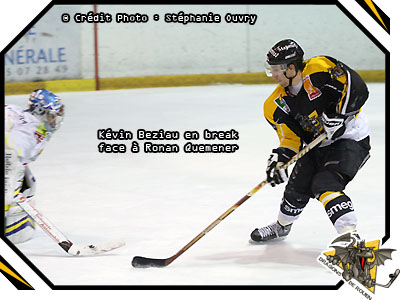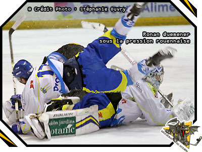 Ainsi, mis en confiance par plusieurs interventions autoritaires de leur gardien Adrien Fenart de la mitaine (07'12 & 13'19), les Dragons faisaient de leur début de partie une partition véloce à l'image de cet engagement dans la zone défensive rouennaise qui profitait à Kévin Beziau. Arrachant le palet, le rouennais slalomait rapidement au milieu des défenseurs gapençais surpris avant de prendre l'échappée (08'27) Décisif comme une bonne partie de la rencontre, l'ex-portier rouennais Ronan Quemener intervenait pour endiguer le flot. En bon capitaine, après avoir ouvert le bal des occasions en tout de début de rencontre sur un palet chapardé, Thomas Dreyfus poursuivait l'offensive en présentant ses meilleurs voeux au banc gapençais pour l'ouverture du score sur un bon travail de son alter ego ailier Anthony Rech (11'12). Tout sourire, le rouennais rentrait sur un banc jaune et noir enthousiaste et prêt à poursuivre l'aventure. Après une première partie de tiers où les occasions n'étaient pas légions, le reste de la période tournera au récital offensif jaune et noir. Mis sous pression par Bryan Ten Braak qui voyait son lancer repoussé par le poteau (12'55) Ronan Quemener multipliait les arrêts et permettait à son équipe de rester dans le match. Parfait sur un mouvement enthousiaste d'association Alexandre Mulle – Thomas Dreyfus en une deux pour un nouveau lancer (16'18), important sur la tentative de Quentin Berthon suivi du rebond de Kévin Marias-Magill (16'26), Ronan Quemener n'aura de cesse de poser une à une les briques du mur devant sa cage jusqu'à la sirène de la première période. Malheureusement pour « Ronnie », il ne pouvait rien contre la malchance, celle d'un renvoi bien hasardeux derrière sa cage d'un des siens ricochant on ne sait où avant de finir au fond de ses filets (15'45) Mis en danger sur la fin de la période (19'14) sur un intense moment de panique, les Dragons pouvaient compter sur leur portier pour calmer le jeu et permettre à tout ce petit monde de regagner le vestiaire sur le score de 2-0 à la faveur des dragons.