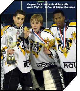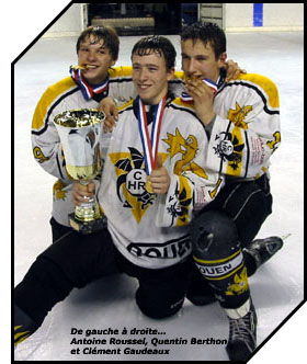 Sans doute se souviendront-ils longtemps de ces quelques moments passés sur le glaçon de Bercy au terme de la finale du championnat de France minime 2005. De longues étreintes, des embrassades à n'en plus finir... des instants de joie tout simplement pour les minimes rouennais qui réalisaient le week-end dernier le rêve de toute une saison en passant autour du cou la médaille de champion de France 2005.... Une médaille d'or pour une équipe en or qui aura passé un week-end parisien mirifique.