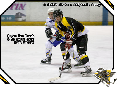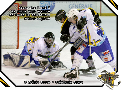 Après une deuxième période totalement à l'avantage des Rouennais face à des dunkerquois littéralement asphyxiés, difficile désormais de prévoir l'issue de la rencontre. Découragement des Normands face à un regain de forme des Nordistes ou mise à mort du corsaire blessé par un Dragon imperturbable ? Malheureusement pour les Normands sera retenue comme conclusion de cette rencontre. Sortis du gouffre, les Corsaires se montraient à nouveau véhéments face à Fabrice Lhenry. Ainsi, il fallait tout le sens du sacrifice de Cédric Custosse pour se coucher sur un puissant lancer de Karl Dewolf (40'16) Plus équilibrée la rencontre tergiversait encore pour choisir son camp pour quelques minutes encore. Non pas sur cette tentative rouennaise de Valentin Dumelie suivie d'un rebond pour Kévin Beziau (45'13) mais sur l'opportunité suivante, dunkerquoise cette fois. Sur une pénalité différée, une série d'arrêts de Fabrice Lhenry ne suffisait pas pour contrarier le sniper François Rozenthal.qui marquait le « game-winning goal » de la rencontre (49'49) Sans le savoir, le meilleur compteur de la poule A venait de porter un coup fatal aux Dragons. Malgré un Fabrice Lhenry toujours aussi sur de lui relayé parfois par le sacrifice de ses défenseurs à l'image de Clément Hondier se jetant face au palet (51'15), les rouennais ne parviendront pas à renverser la vapeur en dépit d'une dernière grosse occasion pour Kévin Beziau seul face à Arthur Legrand (56'33) Le score restera en l'état, 2-1 à la faveur des Corsaires de Dunkerque qui auront su laisser passer l'orage du deuxième tiers pour prendre les devants sur l'expérience. Prochain rendez-vous pour les Dragons avec un bien périlleux déplacement à Clermont-Ferrand, 6ème au classement avec un point d'avance sur les rouennais, 7ème.