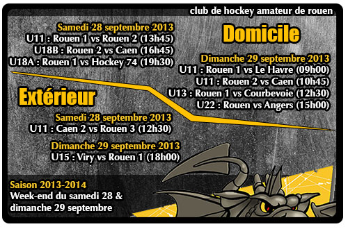 Attendus de pied ferme ce samedi du coté de la Skoda Arena par les Pingouins de Morzine-Avoriaz les Gets , les Dragons du Rouen Hockey Elite 76 déserteront ce week-end leur tanière de l'Ile Lacroix. Toutefois, la patinoire rouennaise ne sonnera pas creuse à l'occasion de ce dernier week-end de septembre avec pas moins de sept matchs au programme pour le hockey mineur. Des moins de 11 ans (Poussins) à leurs ainés Espoirs, c'est toute une armée de jeunes Dragons qui défendront les couleurs jaunes et noires tout au long de ce week-end.