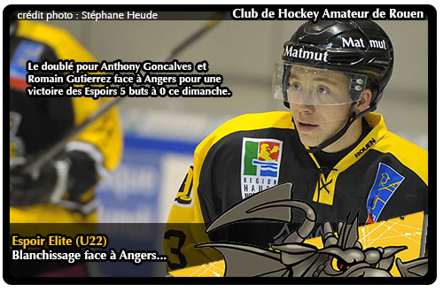 Pour les Dragons rouennais, sevrés de matchs depuis leur victoire à domicile 6-3 face à Amiens (18 septembre), la rencontre face à Angers n'aura guère souffert de discussion. En menant 3-0 après 10 minutes de jeu, Anthony Goncalves ouvrant le bal (01'41), rejoint dans la foulée par Antoine Mony (08'19) et Romain Gutierrez (09'57), les seinomarins se plaçaient dans les meilleurs dispositions possibles. De fait, avec une deuxième période où ils parviendront à inscrire deux nouveaux buts, Romain Gutierrez (26'06) et Anthony Goncalves (34'14) s'adjugeant le doublé, les Espoirs du duo Garnier – Kinding prendront la mesure de leurs adversaires angevins 5 buts à 0 au terme d'une rencontre placée sous le signe des retrouvailles entre frères, et un joli clin d'oeil avec d'un coté chez les Ducs, le défenseur et ancien rouennais Florent Aubé et de l'autre son cadet de frère Dylan.