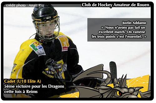 Déjà en difficulté la semaine dernière face à Hockey 74 sur l'Ile Lacroix (victoire 3 buts à 2), les Rouennais auront également souffert à Reims à l'occasion de la 5ème journée du championnat Cadet Elite A avec une victoire 4 buts à 2. 5 matchs, 5 victoires pour les Dragons qui se rendront à Angers la semaine prochaine, certes un bilan parfait mais non dénué de nuages à l'image de la rencontre du soir en Champagne résumée en quelques mots par Justin Addamo, l'un des attaquants rouennais, auteur d'un but et d'une passe sur la rencontre « Nous n'avons pas fait un excellent match. On ramène les trois points c'est l'essentiel. »