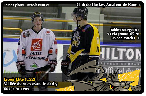 C'est donc au Coliseum d'Amiens que les Dragons passeront leur samedi soir pour le compte de la 8ème journée du Championnat Espoir Elite. Si bien sur du coté des Rouennais, c'est un rendez-vous que l'on attend toujours avec impatience, il en est de même chez les samariens toujours heureux d'accueillir leur « ennemi préféré » sur leur glaçon. A l'image de Fabien Bourgeois, le défenseur d'origine morzinoise et néo-Gothique, déjà bien au fait de la rivalité entre Rouen et Amiens « le match de ce mercredi sera pour moi comme chaque derby entre ces deux clubs, un match très disputé, c'est en cela que c'est intéressant de jouer ces matchs là, cela promet d'être un bon match », la troupe amiénoise attendra de pied ferme les Dragons d'autant plus qu'après tressautements au démarrage (courte victoire à Angers suivie de deux défaites à domicile face à Grenoble puis sur l'Ile Lacroix face à Rouen) les Gothiques restent sur une belle série de quatre victoires.