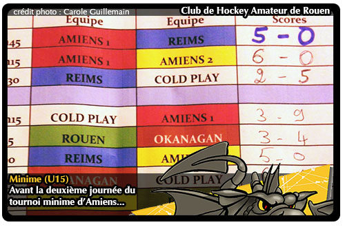 Au crépuscule de cette première journée, les Rouennais présentent un bilan de deux victoires pour un match nul et une défaite avec à la clef une troisième place et la possibilité de chaparder la deuxième place à son éternel rival d'Amiens 1 en cas de victoire d'Okanagan sur le voisin picard (match à 09h45) et bien sur un succès des Dragons face à Reims pour son dernier match de poule (match à 11h15) Suite des aventures minimes en Picardie dans la journée...