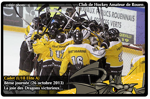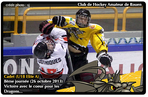 8ème journée Cadet Elite A (Samedi 26 octobre 2013) Rouen - Amiens 3-2 (0-0 / 2-2 / 1-0) 23:22: 0-1 Amiens: 18: Loïc COULAUD (19: Julien GUILLAUME; 12: Rudy MATIMA) 29:53: 1-2 Rouen: 21: Justin ADDAMO (20: Maxime DORDET) 50:40: 3-2 Rouen: 13: Arthur BICHOT (18: Yoann COUBRET; 21: Justin ADDAMO)