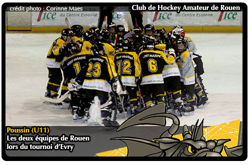 Comme un symbole c'est au centre de la glace de la patinoire d'Evry que les deux équipes poussins de Rouen feront le traditionnel cri de guerre avant de s'affronter au crépuscule de la première journée de la Totem's Cup organisée parfaitement par le club d'Evry. Trois jours de hockey pour les huit équipes poussins en lice pour ce tournoi de la Toussaint. 3 jours et un duel dans les duels entre Rouen 1 et Rouen 2, adversaires, certes mais unis pour donner une belle image du Club de Hockey Amateur de Rouen.