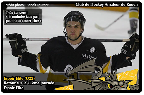 Statu quo au classement à l'issue de cette parodie de journée Espoir Elite avec néanmoins la mauvaise affaire pour les Gothiques d'Amiens contraints d'abandonner leur troisième place au profit de la multi-association Hockey 74 qui aura pu disposer sereinement de la lanterne rouge, Villard de Lans 4 buts à 0. Même score pour les Brûleurs de Loups de Grenoble qui rejoignent Rouen à la cime du classement en balayant Gap. Bonne affaire également enfin pour Angers, vainqueur de Reims 7 buts à 3 qui chaparde au passage la 6ème place du classement.