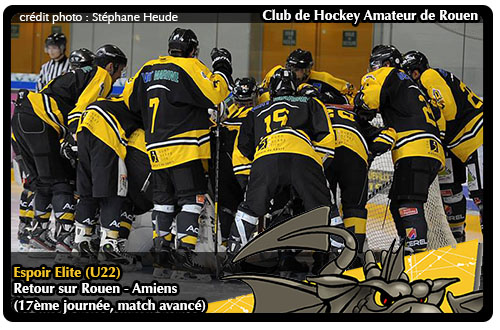 En match avancé de la 17ème journée du championnat Espoir Elite, c'est un joli embrouillamini qui se sera déroulé sur le glaçon de l'Ile Lacroix avec un match à rebondissements avec in fine une victoires des Dragons Rouennais 7 buts à 6.