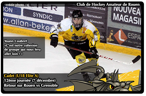 Les choses se précisent pour les Cadets Elite A de Rouen avec une douzième victoire en autant de rencontres pour les Rouennais. Un bilan sans défaite intéressant alors que le sprint final de la saison régulière s'approche à grands pas. Avant d'aborder le dernier match de l'année civile 2013, les Dragons seront parvenus à venir à bout de grenoblois plutôt coriace à l'instar du match aller disputé à la patinoire de Pole Sud (courte victoire 1-0)