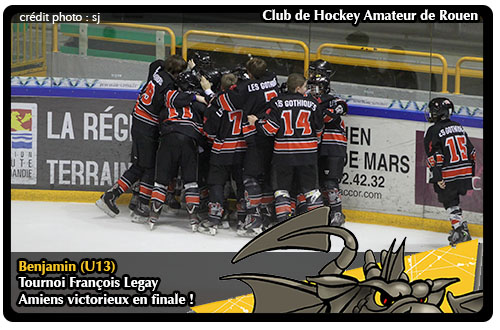 Avec un score à leur avantage de 3 buts à 1, l'équipe amiénoise, emmenée par Stéphane Berthon se dirigeait vers son troisième succès lors du tournoi de Rouen en cinq années. Mais avant de toucher le trophée, c'est toute une patinoire acquise à la cause des panthères qui exultait de joie alors qu'ils revenaient à 2-3 à une dizaine de minutes de la fin. Plus solide, plus organisée, la belle machine amiénoise au dessus en terme de niveau devait faire face à un obstacle de choix la détermination des panthères à s'imposer à Rouen à l'image de cette séquence où le gardien amiénois, toujours aussi talentueux, devait s'employer pour empêcher un troisième palet de franchir sa ligne de but. Peut-être le tournant du match puisqu dans la foulée les Gothiqus, à six minutes de la fin du match y allait d'un quatrième but pas loin d'être décisif. Plus rien ne sera marqué dans ce tournoi, Amiens s'imposant logiquement 4-2 face à une courageuse équipe des Panthères, remportant au passage le trophée François Legay 2013.