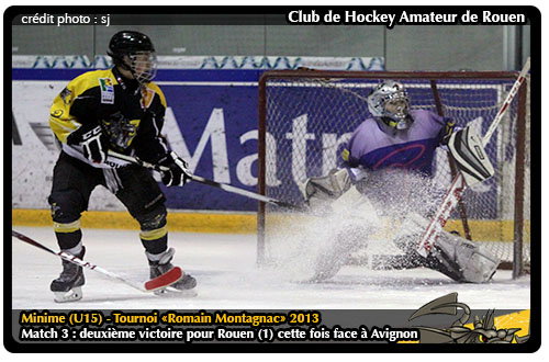 Fringants en première période et accrocheurs, les « sudistes » connaitront un moment de moins bien en début de seconde période. Un relâchement sanctionné immédiatement par les Dragons avec trois buts en l'espace de trois minutes paraphés par Victor Ranger (20'31), Emmanuel Jamin (23'06) et Juraj Stefanka (23'20) Finalement, l'addition pour les Castors devenait un soupçon salée avec un tableau des scores affichant un 9-0 à la faveur des seinomarins. Et pour "l'Isle sonnante" les affaires ne s'arrangeront pas sur la fin de match, Victor Ranger s'adjugeant le dixième but rouennais (31'20) Néanmoins, loin d'abandonner leurs couleurs, les Castors d'Avignon se battront jusqu'au bout face à des Dragons y allant à l'économie sur la fin de match. Score final 10-0 à la faveur des Dragons face à des Castors toutefois à surveiller pour les places d'honneur au classement du tournoi.