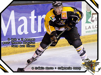 Ainsi, à l'orée de la troisième période, « big smile » de rigueur pour Thomas Dreyfus au lancer certes pour le moins tendancieux mais qui se relevait être le « gold game winning goal » (copyright N.Levasseur) avec un 4-3 crucial (40'45). Quoi de mieux pour lancer la période qu'un but des Dragons. Un brin démoralisés, les campinois finiront par se résigner à déposer les armes. Dépassés physiquement par l'enthousiasme des Dragons, les parisiens ne pouvaient plus suivre le rythme imposé et finissaient par se laisser aller à de coupables gestes. Sur Clément Hondier d'une part avec un « attentat gratuit » qui aurait pu occasionner plus de dégâts puis de façon moins grandiloquente emmenant les parisiens à devoir gérer une double infériorité numérique (46'48) De fait, dans ces conditions là, difficiles pour les dragons de ne pas faire frissonner d'émotion les filets parisiens à nouveau. En expert en la matière, Nicolas Levasseur sortait son lancer le plus intense pour décrocher le cinquième but de la rencontre (47'27) Cette fois, définitivement hors du coup, les Elans souffriront jusqu'à la sirène finale. Ainsi, une poignée de minutes plus tard, une parfaite passe de Thomas Dreyfus permettait à Kévin Beziau de parachever un sympathique trio de buts (53'02) tandis que Bryan Ten Braak récitait ses gammes en concluant un mouvement initié par Germain Raimbourg (54'42) En l'espace de quelques minutes, le tableau d'affichage s'était affolé à tel point que les franciliens accusaient désormais un retard de quatre buts. Quatre puis cinq puisque à l'approche de la dernière minute, le premier trio jaune et noire parachevait une rencontre sérieuse en ajoutant un but orgasmique sur un splendide « tic tac toe » devant la cage entre Alexandre Sucré, Thomas Dreyfus et Valentin Dumelie à la conclusion (58'55) Fin de la rencontre sur le score de 8 buts à 3 à la faveur des Dragons, une victoire qui les embarque donc à une méritée 6ème place au classement avant de disputer les play-offs dès la semaine prochaine.