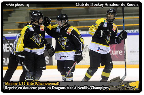 Pourtant la première partie de la rencontre semblait indiquer que les Dragons allaient devoir se mettre à la besogne pour se sortir de cette rencontre. Bien qu'ouvrant le score rapidement après seulement une minute de jeu (01'13), les nocéens se montraient véhéments pour revenir au score quelques minutes plus tard (07'19) Un coup de semonce parisien qui avait le mérité de secouer un Dragon encore sur le « groove » des fêtes de fin d'année. En l'espace de deux minutes, les Rouennais affirmaient leur point de vue en plantant deux banderilles dans la période pour porter le score à 3-1 (12'02 & 13'12) De fait, de retour sous des auspices plus radieux avec les faveurs du tableau d'affichage, les Rouennais prendront leurs aises durant les deux tiers restants. 3 buts dans le tiers médian, 4 dans l'ultime période, au final les Rouennais, en douceur, auront su creuser l'écart pour s'imposer 10 buts à 1 face à l'association Neuilly sur Marne / Champigny.
