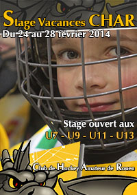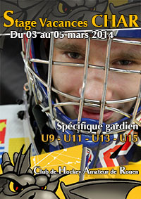 - Du 03 mars au 05 mars 2014 : le Club de Hockey Amateur de Rouen vous propose un stage spécifique gardien encadré par son entraîneur des gardiens Christophe Renard par groupe de niveau et d'âge réservé aux gardiens des catégories : U9 - U11 - U13 - U15. Au programme, de la glace avec une heure et demi par jour mais également du conditionnement physique encadré par le préparateur physique du club Thomas Brulin, de la théorie, des sports collectifs et des séances vidéos. Un programme complet avec le déjeuner et le gouter de prévu.