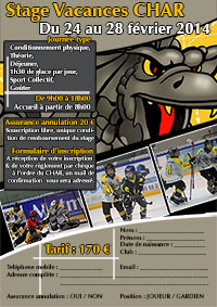 Ne perdez pas le rythme pendant les vacances scolaires ! Le Club de Hockey Amateur de Rouen vous propose de passer des vacances studieuses sur la glace du 24 février au 28 février 2014 pour les joueurs et gardiens et du 03 au 05 mars 2014 avec un spécfique gardien.