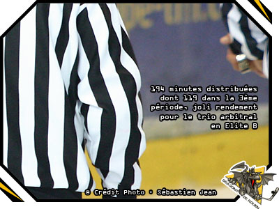 Que faudra-t-il retenir du déplacement de l'équipe Elite B de Rouen à Tours à l'occasion du match retour de la poule ouest ? La victoire logique 11 à 6 des tourangeaux avec un cinglant 5-0 durant la troisième période ? Les 194 minutes de pénalités distribuées sur l'ensemble du match, 127 pour les Dragons, 67 pour les Diables Noirs ? Les 4 expulsés sur la partie, trois rouennais, un tourangeau ? Les deux blessés rouennais : Alexandre Chergui et Florian Duval ? Plus que ces chiffres, il conviendra de retenir le comique de situation d'une rencontre burlesque, ubuesque qui aurait pu faire rire pendant des siècles si les premiers pénalisés n'étaient pas les joueurs des deux équipes qui auront vu leur plaisir simple de jouer au hockey confisqué par le trio arbitral.