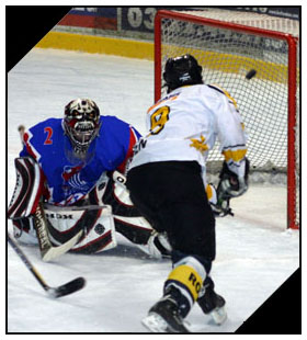 « On va jouer le hockey ! » martelait André Svitac dans le vestiaire rouennais avant la partie. Effectivement, les jeunes rouennais profiteront du premier tiers pour mettre en déroute la formation caennaise. Si les cinq premières minutes de la partie permettaient à chacun de boucler sa sieste post repas, rapidement, la formation parée de jaune et de noir incendiait la défensive de la Basse Normandie. Infortuné que ce gardien bas-normand qui ne savait plus où donner de la tête. Par le centre, par les ailes, les Rouennais s'engouffraient dans chacune des brèches défensives des bas normands à l'image de Jérémie Romand qui s'offrait une première embardée véloce avant de se briser les dents sur le portier (07'58) Têtu, on retrouvait le numéro 17 jaune et noir sur l'ouverture du score des Dragons, une passe de derrière la cage de Jérémie plein centre pour Loïc Lampérier et Rouen menait alors 1-0 (08'10) Loin d'en rester là, l'artillerie rouennaise sortait ses plus beaux atouts pour séduire la rondelle. Sur une sortie de zone de Cédric Custosse relayée par Cyril Lambert, Julien Correia se mettait dans la lumière (08'23) De même pour Thomas Dreyfus dans la foulée à la déviation sur un lancer de Nicolas Motreff (10'07) Si les deux larrons ne parvenaient pas à remplir les filets caennais, il n'en était pas de même de Lionel Tarantino qui ramassait une passe de Julien Correia du coin pour porter la marque à 2-0 (12'45) La machine lancée, difficile pour les Caennais de l'enrayer. Bing ! Bang ! Boum ! C'est dépressif que le portier caennais rentrera au vestiaire après le passage de l'ouragan rouennais sur la fin de tiers qui permettait à Thomas Dreyfus (13'27), Jérémie Romand (14'46) et Loïc Lampérier (15'10) d'inscrire leur nom sur le tableau d'honneur des buteurs de cette partie.