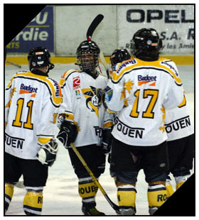 Premier match de la deuxième journée du tournoi cadet d'Amiens pour les Dragons rouennais qui avaient à charge d'affronter l'équipe de Grenoble... Comme un soupçon de nostalgie sur la glace picarde, les deux équipes s'étant affrontées pour la dernière fois lors du carré final isérois de l'année dernière au cours d'une finale qui consacra cette équipe cadet de Rouen. Depuis l'eau aura coulé sous les ponts... Autre saison, autre équipe, autre perspective pour les jeunes jaunes et noirs qui débutaient la partie face aux Isérois sous les meilleurs auspices. Lancé comme un roquette par Martin Croguennec, Julien Correia s'accaparait l'entrée en zone avant de décocher une mine qui surprenait le portier grenoblois (0-1 à 00'50) Si Lucas Normandon avait manqué d'inspiration pour le coup, cela sera bien la seule fois de la première période. En effet, diminuée par quelques blessés et autres malades, la formation au loup ne semblait pas en mesure de mordre la carapace du Dragon. A charge à son cerbère de retarder l'échéance notamment sur cette énorme mitaine face à Martin "Bazooka" Croguennec (10'51) ou encore face à Loïc Lampérier sur un tour de cage pourtant habile (11'45) Au four et au moulin, Normandon finissait par s'incliner une deuxième fois. Sur la spéciale power-play, Julien Correia feintait le lancer avant de servir Martin Croguennec pour le deuxième but haut normand (0-2 à 13'45) Grosse période de trouble au sein de la défensive iséroise en feu sur les accélérations offensives rouennaises. Une grosse remontée de glace de Julien Correia (16'32) suivi d'une double tentative de Martin Croguennec (16'45 & 16'57) permettait à Lucas Normandon de se placer à nouveau sous les projecteurs.