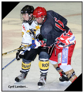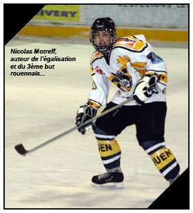 Sur l'engament suivant, c'est un joli mouvement rouennais en contre qui mettait à mal la défensive rouge et noire. Depuis sa zone défensive, le Dragon s'empressait de sortir en deux contre un, Erwan Agostini ne manquait pas la passe pour son capitaine Julien Correia qui mystifiait le portier Basso pour le deuxième but des jaunes et noirs (1-2 à 32'16) Méconnaissables, les Rouennais enchaînaient les mouvements scintillants. Brinquebalé, chahuté, pris dans la tempête de tout part le navire rouge et noire tanguait et manquait de peu de se faire à nouveau éperonner par le duo Tarantino - Correia. Un une-deux vif qui laissait pantois la défensive gothique au contraire de son portier Basso qui s'interposait de justesse (39'14) Même schéma sur l'offensive suivante où les deux larrons mettaient à nouveau le feu chez les picards. Alexis Basso parti cueillir des pâquerettes, c'est Prophette qui sauvait son équipe en gelant la rondelle dans la zone du gardien. Illicitement au goût de l'homme aux bandes oranges qui croisait les mains au dessus de la tête : lancer de fusillade. "Kazakh ! Kazakh ! Kazakh !" Ah non c'est pas là ! ;o) C'est Nicolas Motreff qui se chargeait d'infliger la punition. Tout en finesse, le numéro 11 jaune et noir s'en allait en découdre avec succès avec le cerbère rouge et noir qui cherchait encore le palet au moment où Nicolas Motreff rentrait sur son banc pour se faire congratuler par les siens pour le 3-1 (39'26) La deuxième sirène arrivait fort à propos pour des Gothiques, la tête sous la glace pendant dix minutes et qui espéraient bien pouvoir faire oublier le cauchemar de la deuxième période lors du dernier opus.