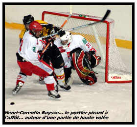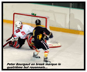 Il restait encore vingt minutes aux Dragons pour parachever le travail entrepris lors de la fin de la seconde période. Malheureusement, les Normands ne parvenaient pas à mettre à mort l’animal blessé. Bien au contraire, la bête retrouvait un second souffle et ruait à nouveau sauvagement en donnant un violent coup de semonce aux Dragons par Pierre Brohard oublié par la défensive rouennaise (3-2 à 48’07) Une minute plus tard, les Gothiques pouvaient même revenir à parité sans la maladresse de Julien Maréchal qui pleurera toutes les larmes de son corps après le match pensant sans doute à cette incroyable deux contre un qu’il vendangeait face à Richard (49’18) La chance picarde était passée, les mouches changeaient à nouveau d’âne et les Dragons prenaient la main dans la partie. En deux contre un, Agostini glissait pour Tarantino mais Buysse intervenait (52’20) Une fois de plus le portier de la somme se montrait présent tout comme sur l’occasion suivante signée d’Alexandre Sucré qui profitait d’une belle entrée de zone d’Edouard Dufournet pour tenter sa chance (53’21)